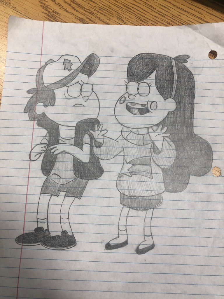 Firstly, I sketched and drew the two main characters from the show, Dipper and Mabel, all while using reference photos. Here’s the final sketch: